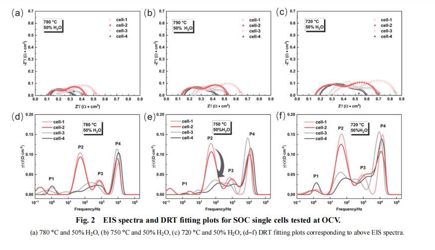 圖2為單電池在不同溫度、水分壓和開路電壓下的電化學交流阻抗譜及DRT(弛豫時間分布法)擬合結果。從圖中可以看出,采用水熱原位生長法制備的致密薄膜GDC隔離層能夠顯著降低單電池歐姆阻抗:在750°C、50%H2O和開路工況下,cell-2和cell-4的歐姆阻抗僅為0.128和0.153Ω?cm2,相比于cell-1和cell-3分別降低了~48%和~30%。此外,大孔氫電極單電池的極化阻抗也顯著減小,在上述工況下,cell-3和cell-4的極化阻抗為0.311和0.284Ω?cm2,相比cell-1和cell-2分別降低~22%和~28%。從DRT擬合結果可以看出,大孔氫電極單電池cell-3和cell-4的P2響應峰(主要為氫電極氣體擴散主導)相比于cell-1和cell-2明顯降低。在750°C、50%H2O和開路工況下,cell-2的氫電極擴散阻抗的DRT擬合值為0.168Ω?cm2,而cell-4僅為0.089Ω?cm2,表明大孔氫電極顯著加速了氣體擴散過程。此外還發現,采用水熱原位生長法制備的GDC隔離層能夠進一步降低P2、P4響應,這可能與單電池氧電極界面接觸優化、氧離子傳導阻力減小有關。