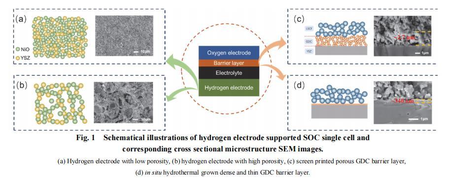 如圖1所示,還原后的小孔氫電極表現出亞微米尺寸海綿狀孔,主要由NiO還原為金屬Ni的過程中形成;相比之下,還原后的大孔氫電極還具有造孔劑燒蝕后形成的球形或橢球形不規則大孔,最大孔徑尺寸達到~20μm。在隔離層方面,絲印GDC為典型多孔結構,厚度為~2.7μm;水熱原位生長GDC隔離層則為致密薄膜,厚度為~340 nm。