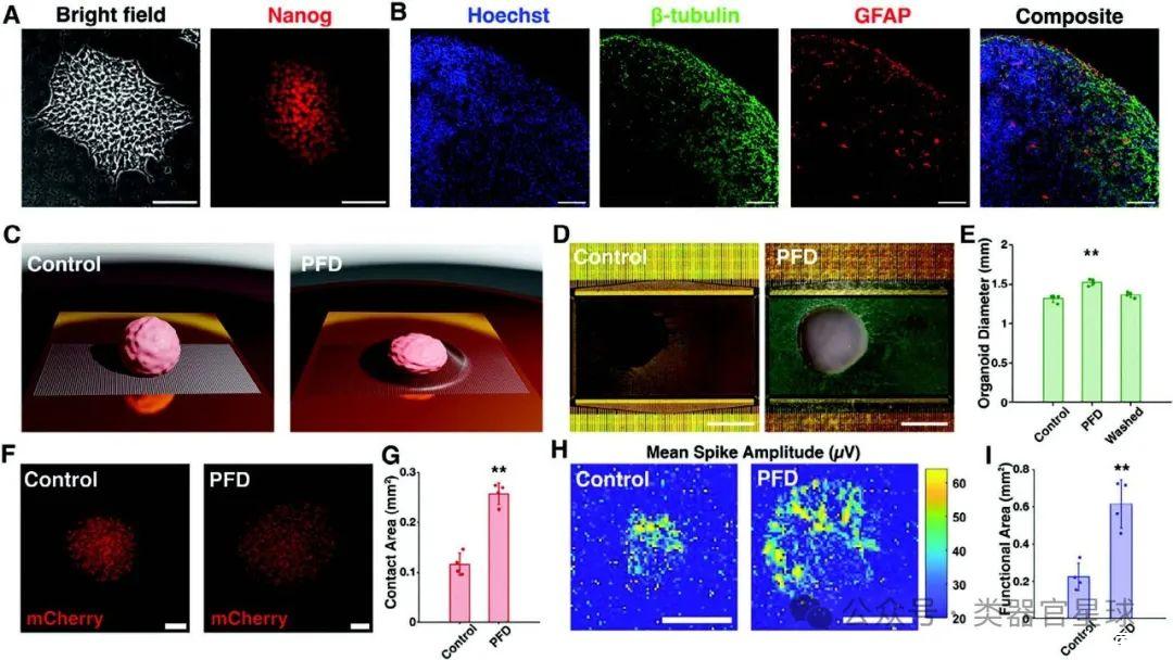 該方法不僅適用于長期培養的細胞,還能夠用于急性神經組織的記錄。研究者們通過在MEA上覆蓋PFD,成功穩定了自由漂浮的神經類器官,并實現了對其電生理活動的清晰記錄。