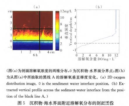 (圖(a)為剖面溶解氧濃度的兩維分布,0為沉積物-水界面分界點;圖(b)為從圖(a)中所抽取的黑線A的溶解氧垂直梯度變化。