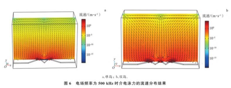 a.單島;b.雙島。圖6電場頻率為500 kHz時介電泳力的流速分布結果