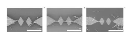 單島微電極進行了納米線介電組裝實驗之后,在寬度相同的雙島微電極中再次進行納米線的介電組裝實驗,實驗結果見圖3.圖3a顯示,電場頻率為150 kHz時,左側的微間隙以及2個導電島間的微間隙沉積了少量納米線,且兩側電極上同樣沉積了少量納米線;圖3b顯示,電場頻率為500 kHz時,電極系統中納米線組裝數量顯著提升,且微間隙被多根納米線搭接,同時出現少量的互相平行的納米線;圖3c顯示,電場頻率為1 MHz時,電極系統內組裝的納米線少量增加,微間隙之間仍然存在納米線搭接現象,總體趨勢和500 kHz時相差不大。