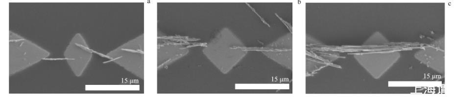 為了探究納米線的介電組裝特性,首先在寬度約為4μm的單島微電極上進行ZnO納米線的組裝實驗,不同頻率下的實驗結果見圖2.圖2a顯示,電場頻率為150 kHz時,有少量納米線將導電島和電極搭接起來;圖2b顯示,電場頻率為500 kHz時,搭接導電島和電極的納米線數量增多,且左右兩側的電極上也沉積了少量的納米線;圖2c顯示,電場頻率為1 MHz時,搭接導電島和電極的納米線數量再次增多,并且出現了互相平行的納米線。
