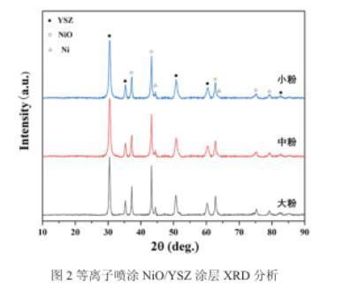 圖2為等離子噴涂NiO/YSZ氫電極的XRD圖譜,可以看出氫電極中除NiO與YSZ外,還出現(xiàn)了金屬Ni相,這是由于在高溫等離子體中NiO發(fā)生了還原。從圖中可看出,隨粉末粒徑的變化,還原Ni的含量變化不大。利用K值法定量分析了還原前氫電極中Ni的含量表明,在噴涂過程中,小粉、中粉、大粉制備的氫電極中NiO還原為Ni的含量分別為9.25%、10.82%、9.97%。