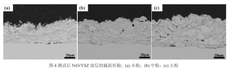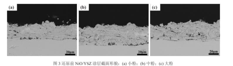 圖3還原前NiO/YSZ涂層截面形貌:(a)小粉;(b)中粉;(c)大粉