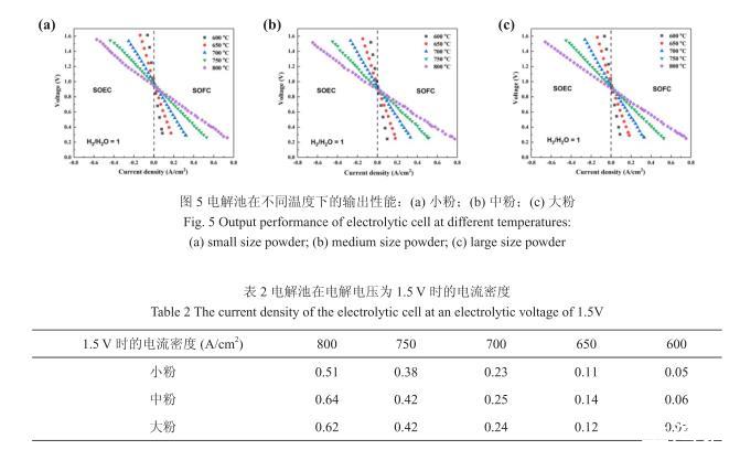 圖5為電解池Ni/YSZ|ScSZ|LSCF的氫電極以50%H2O/50%H2為反應(yīng)氣體,氧電極暴露在空氣中的輸出性能測(cè)試結(jié)果。從圖中可看出,所有電解池的開路電壓與理論開路電壓值基本相同。電解池的開路電壓(OCV)在600℃到800℃范圍內(nèi)隨著溫度的升高而降低。在SOEC模式下,電池的電解電壓隨著電流密度(絕對(duì)值)增加而升高;在SOFC模式下,電池的放電電壓隨著電流密度的增加而減小。在整個(gè)測(cè)試區(qū)間,隨著溫度升高,V-I曲線斜率下降,單位電流密度升高所需的電解電壓減小,電解池的性能提高。當(dāng)電解電壓為1.5 V,由小粉、中粉、大粉制備的氫電極組裝的電解池在800℃時(shí)的電流密度分別為0.51 A/cm2、0.64 A/cm2、0.61 A/cm2,其他溫度下的具體數(shù)據(jù)如表2所示。因此,在一定的電解電壓下,電解電流密度隨溫度的升高而顯著升高。其中,中粉制備的電池電解電流密度最高。
