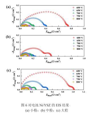 圖6給出了相對(duì)應(yīng)測(cè)試條件下Ni/YSZ對(duì)稱電池的EIS結(jié)果。高頻區(qū)實(shí)軸截距為電解質(zhì)、電極等整個(gè)電池的歐姆阻抗,阻抗弧在實(shí)軸上的截距為氫電極極化阻抗,為了更好的對(duì)比,圖中忽略歐姆阻抗而將極化阻抗歸一化給出。在800℃,小粉、中粉、大粉制備的氫電極的極化阻抗分別為0.13Ω·cm2、0.12Ω·cm2、0.15Ω·cm2;當(dāng)溫度降低到600℃時(shí),阻抗分別增加至0.76Ω·cm2、0.48Ω·cm2、1.02Ω·cm2。考察電解池輸出性能與氫電極阻抗的關(guān)系發(fā)現(xiàn)兩者之間存在良好的對(duì)應(yīng)關(guān)系,即隨氫電極阻抗的增加,電解性能呈下降趨勢(shì)。