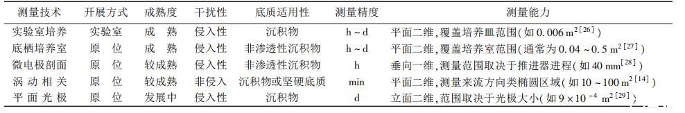 除水環境渦動相關技術外,目前測量沉積物水界面通量的方法還有實驗室培養技術(laboratory core incubation)、底棲培養室技術(benthic chamber)、微電極剖面技術(micro-profiling)和平面光極技術(planar optode)等,主要技術特性對比見表1??偟膩碚f,渦動相關技術因其將觀測點布置于沉積物水界面上方而具備非侵入式觀測的顯著優點,又具有測量范圍廣和時間精度高等特點,能夠對傳統方法難以適用的高滲透性砂質底泥和生長水棲植物的堅硬底質進行長期觀測。但是,該技術對數據處理方法提出了較高的要求,且可測量的通量類型受到傳感器性能發展的限制。