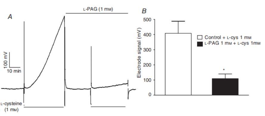 圖3、L-PAG阻斷大鼠肝臟的半胱氨酸依賴性硫化物合成。使用unisense硫化氫電極記錄浸入1毫升含1mM半胱氨酸的PSS中的大鼠肝臟(175毫克)產(chǎn)生硫化物并釋放到PSS中的情況。小瓶密封以防止硫化物流失,溶液預(yù)先用N2/CO2通氣以去除O2,從而最大限度地減少硫化物氧化。A,在沒有(左)和有(右)1mM L-PAG的情況下,1mM半胱氨酸釋放硫化物的示例。B,在沒有L-PAG和有L-PAG的情況下,半胱氨酸誘導(dǎo)硫化物釋放的平均值。實(shí)驗(yàn)在成對組織中進(jìn)行,結(jié)果與對照組織中觀察到的硫化物釋放量進(jìn)行了歸一化處理。