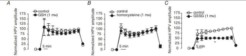 圖5、硫化物前體GSH、GSSG和同型半胱氨酸對PAG存在和不存在時(shí)0%O2氣體誘發(fā)的HPV的影響。在將IPAs與GSH(A,1mM,n=11)、GSSG(B,1mM,n=8)或同型半胱氨酸(C,1mM,n=5)孵育之前(空心圈)和之后(實(shí)心圈),HPV降至0%O2。