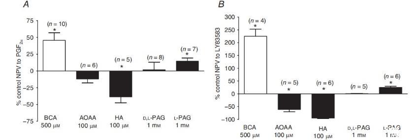 圖1、硫化物合成阻斷劑對PGF2α和LY83583反應(yīng)的影響。A)幾種CSE拮抗劑(BCA,500μM;AOAA,100μM;HA,100μM;D,L-PAG,1mM;L-PAG,1mM)對30μM PGF2α誘發(fā)的收縮的影響。B)幾種PAG阻滯劑對10μM LY83583誘導(dǎo)的收縮的影響。