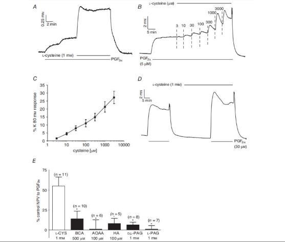 圖2、L-半胱氨酸對IPAs基礎(chǔ)張力和PGF2α誘導(dǎo)的張力的影響。A,顯示5μM PGF2α誘導(dǎo)NPV期間1mM L-半胱氨酸引起張力增加的示例軌跡。B,在5μM PGF2α誘導(dǎo)的NPV期間,半胱氨酸(3μM-3mM)引起的張力增加的濃度依賴性示例。C,使用B所述方案記錄的張力平均增加值,顯示為對80mM K+PSS反應(yīng)的百分比,代表該動(dòng)脈環(huán)的最大收縮量(n=15)。D,1mM半胱氨酸預(yù)處理對30μM PGF2α誘導(dǎo)的收縮的影響示例。E,在無CSE抑制劑(最左側(cè)條)和有CSE抑制劑的情況下,1mM L-半胱氨酸對30μM PGF2α誘導(dǎo)的收縮的平均±SEM影響。