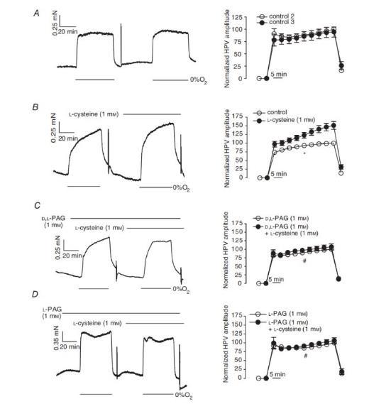 圖4、在無PAG和有PAG的情況下,半胱氨酸對由0%O2氣體誘發(fā)的HPV的影響。在對照組條件下(B,1mM,n=21)和D、L-PAG(C,1mM,n=9)或L-PAG(D,1mM,n=8)存在下,以及不含L-半胱氨酸的時(shí)間對照組條件下(A,n=14),IPA與L-半胱氨酸孵育30分鐘之前(開圓圈)和之后(填充圓圈),HPV至0%O2。在每個(gè)面板中,左側(cè)為平均數(shù)據(jù),右側(cè)為使用該方案進(jìn)行實(shí)驗(yàn)的張力曲線。