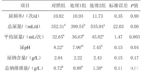 由表3可知,處理3組綿羊尿液總量和平均尿量較其他兩組顯著提高(P<0.05),而對照組和處理1組對這兩個指標的影響無顯著差異(P>0.05)。處理2組較對照組顯著降低了尿液pH(P<0.05)。各處理間排尿次數(shù)、尿鈉濃度均無顯著差異(P>0.05)。