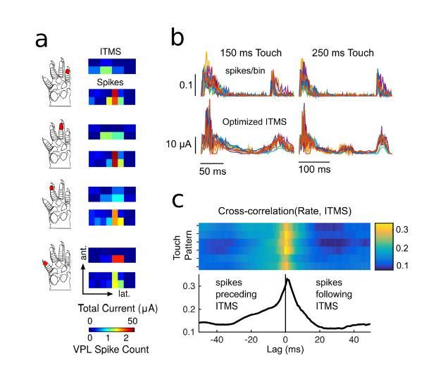 為了量化與VPL放電率的時間相關性,將背景扣除后的PSTH(見方法)與所有動物的優化ITMS進行比較。圖7(b)顯示了兩種不同觸摸持續時間的刺激后放電率和相應的優化ITMS。對于每個時間點,顯示的波形是通道間的最大電流。最強的刺激脈沖在觸摸開始和結束后不久傳遞。這類似于VPL放電率的自然時間模式,因為幾乎所有記錄的觸覺響應神經元都顯示快速適應。