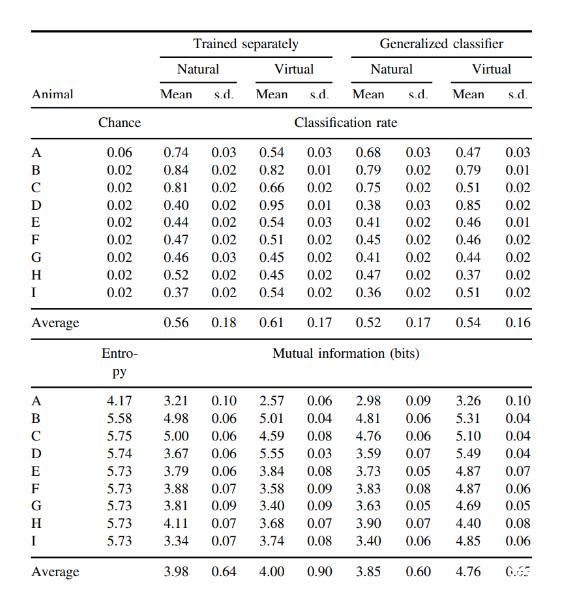 使用每只動物的平均觸摸頻率,表3顯示了真實觸摸標簽(位置、持續時間和幅度)與估計觸摸標簽之間的信息速率(位/秒)。在各動物中,虛擬觸摸攜帶的信息速率與自然觸摸大致相同。單獨訓練的自然和虛擬觸摸的平均信息速率為5.2位/秒,使用廣義分類器的虛擬觸摸的平均信息速率為6.64位/秒。