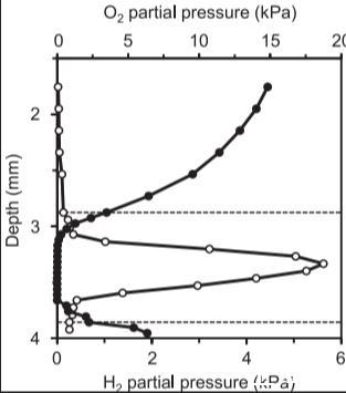 圖2:在瓊脂糖包埋的Nasutitermes corniger前部P3隔室中,相對于瓊脂糖表面的氧氣(O)和氫氣(O)分壓的徑向分布圖。虛線標出了近端和遠端腸壁的位置。這些曲線是從不同白蟻身上獲得的六組相似結果中選出的典型代表。