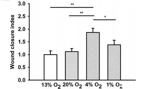 圖3恒定氧氣濃度下的內皮傷口閉合指數。與作為對照的13%氧氣相比,細胞暴露于4%氧氣時傷口愈合率明顯增加。