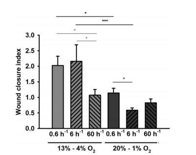 圖3顯示了恒定氧合水平下的分組結果。雖然內皮修復在20%O2和13%O2濃度下總體相似,但在4%O2濃度下,內皮修復出現了相當大的增長(約兩倍)。然而,雖然在1%氧氣濃度下觀察到了類似的傷口閉合反應(與13%氧氣濃度相比,有增加38%的趨勢),但它顯著低于4%氧氣濃度(26%)(P=0.036;n=6/實驗組)。