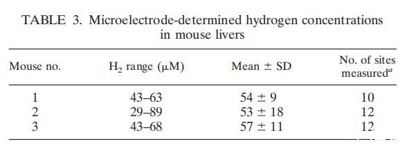 我們使用改良的微電極模型氫氣-50(unisense),用微電極法測定了成年活體小鼠肝臟中的氫濃度(表1)。電極的尖端直徑為50μM。雌性小鼠C57BL使用氟烷麻醉。在整個過程中,小鼠保持存活但完全麻醉,并在最后一次測量后立即進行安樂死。大多數(shù)測量是在探針進入肝臟不到1.0mm時進行的,以免損壞探針。實際上,在最初的一些測量中,當探針插入組織更深處時,探針已受到損壞。在信號穩(wěn)定(約5至7秒)后記錄氫氣讀數(shù)。每只小鼠肝臟最多可在12個部位重復上述步驟,使用校準室獲得氫氣的標準曲線。平均氫含量超過50μM,比表觀Km高出20倍,并略高于報道的小鼠胃中的氫氣含量。組織氫氣測量結(jié)果共同支持了一個假設(shè),即動物體內(nèi)的許多組織中都存在氫氣,因此有必要進一步考慮氫氣作為能量庫供宿主動物體內(nèi)感染性細菌使用的可能性。