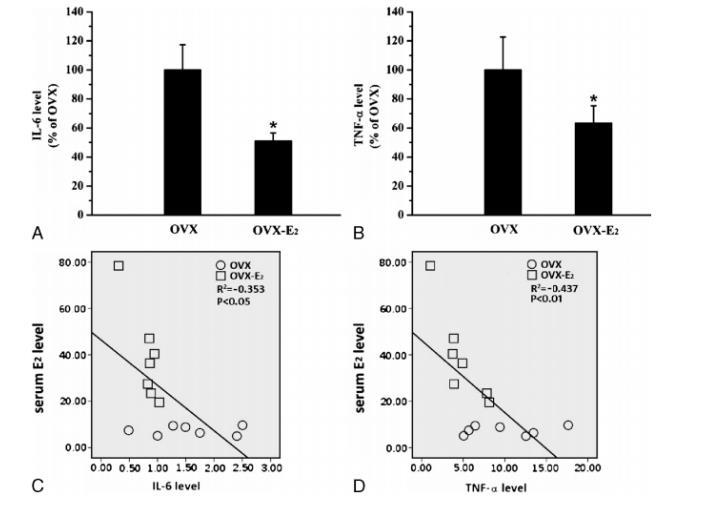 圖4 17β-雌二醇(E2)療法對卵巢切除大鼠心肌中促炎細胞因子水平的影響。A、B:心肌中白細胞介素-6(IL-6)和腫瘤壞死因子-α(TNF-α)的水平。通過酶聯免疫吸附試驗測定IL-6和TNF-α的水平。C、D:血清E2濃度與心肌IL-6或TNF-α水平的相關性。用皮爾遜相關分析E2水平與IL-6的相關性(C)和E2水平與TNF-α的相關性(D)。