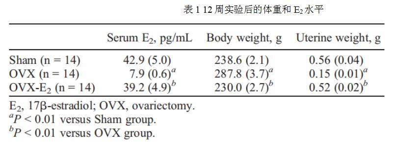 經卵巢切除術驗證,血清E2水平顯著降低,體重增加,子宮重量減少(表1)。E2治療可逆轉OVX引起的變化。