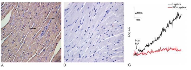 圖1心肌中γ半胱氨酸裂解酶(CSE)的表達和硫化氫(H2S)的生成。A:左心室心肌的代表性CSE免疫染色。如箭頭所示,染色主要定位于心肌細胞。B:陰性對照:CSE被過量10倍的阻斷肽預吸收。C:心肌勻漿中H2S生成的代表性痕跡。在添加或不添加CSE抑制劑D,L-丙炔基甘氨酸(PAG)的情況下,通過添加L-半胱氨酸(L-cys)和磷酸吡哆醛(PLP)啟動H2S生成。