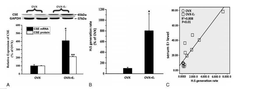 E2療法提高了CSE mRNA和蛋白水平(與單獨OVX相比,mRNA和蛋白水平分別為P<0.05和P<0.01;圖2A)。E2治療增加了H2S生成率(與單純OVX相比,P<0.05;圖2B)。
