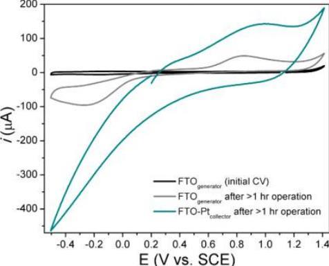 使用FTO進行氧還原。此處描述的用于檢測O?的雙電極策略的早期迭代使用鉑化玻璃表面進行O?還原21,22。雖然Pt為促進O?還原提供了良好的表面,但用鉑化FTO表面構建的集電極-發生器池給出了一些令人沮喪的結果,表明Pt從一個電極表面遷移到另一個電極表面。如圖3所示,在由一個FTO電極和一個FTO-Pt電極組成的雙電極池中,FTO電極的循環伏安(CV)掃描最初顯示出符合清潔FTO表面的波形。在FTO置于形成O?(1.5 V vs SCE)而FTO-Pt置于還原O?(-0.4 V vs SCE)進行一系列實驗后,最初清潔的FTO電極的CV掃描(黑線)顯示出明顯的表面吸附Pt跡象(灰線)。池運行1小時后的伏安圖中在0.7 V vs SCE處的陽極峰和在-0.2 V vs SCE處的陰極峰與氧化鉑層的形成和剝離一致,并且與在FTO-Pt電極上看到的相同特征相匹配。此外,與初始FTO表面相比,在高電位(O?形成)和低電位(H?形成)區域隨時間的催化電流增加表明Pt吸附在FTO上。FTO處Pt特征的增長必定源于Pt從FTO-Pt表面的遷移,并且如果使用FTO-Pt集電極電極,則存在用Pt(一種穩健的水氧化催化劑)污染發生器表面的可能性,從而損害將氧氣產生僅歸因于發生器原始狀態的判斷。