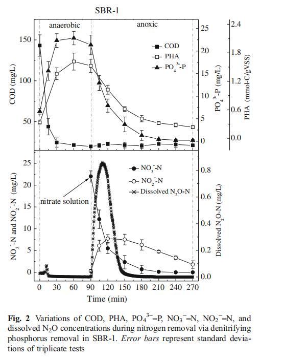 SBR-1中,N?O主要在缺氧階段生成,厭氧階段幾乎未檢測到;KNO?溶液投加后,溶解態N?O-N濃度在前15分鐘迅速升至0.87 mg/L,隨后急劇降至接近零(圖2)。類似地,SBR-2缺氧初期也觀察到N?O瞬時積累(圖3),但其最高溶解態N?O濃度僅0.08 mg/L,遠低于SBR-1。此外,尾氣N?O也被測定,氣相和液相總N?O生成量見表1。可見SBR-1的N?O生成量(占TN去除量的0.41±0.034%)雖顯著高于SBR-2(0.013±0.0056%),但遠低于先前反硝化除磷系統的報道值(2.34–21.6%)(Wang et al.2011a,b)。這可能歸因于使用了丙酸鹽與乙酸鹽的混合碳源,而非單一乙酸鹽。相較于乙酸鹽,丙酸鹽作為碳源顯著降低了廢水處理過程的N?O生成(Zhu and Chen 2011)。