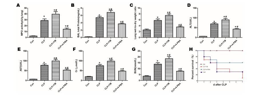 圖6:4-PBA和TM對敗血癥小鼠重要器官功能的影響。給小鼠腹腔注射4-PBA和TM后再進行CLP。術后12小時檢測肺MPO活性(A)、BLA總蛋白(B)、肺W/D(C)、ALT(D)、AST(E)、Cr(F)和BUN(G)。分析小鼠的存活率(CLP手術前、手術后1d、2d、3d、5d和7d)(H)。