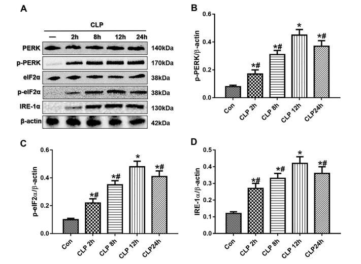 圖2:膿毒癥小鼠肺部內質網應激相關蛋白的表達。在小鼠接受中電手術前、手術后2h、8h、12h和24h采集肺組織。用Western印跡法檢測總PERK(A)和eIF2α(A)、p-PERK(A和B)和p-eIF2α(A和C)以及IRE1α(A和D)。