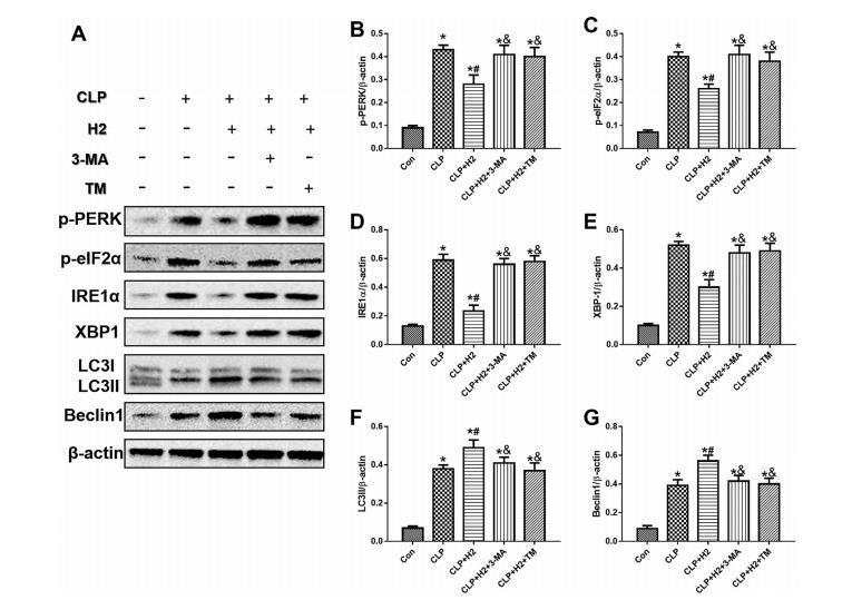 為了進一步研究氫氣、3-MA和TM對敗血癥小鼠ER應激和自噬的影響,研究人員給小鼠注射了氫氣。與CLP組相比,氫氣顯著降低了CLP小鼠p-PERK、p-eIF2α、IRE1α和XBP1的表達,并增強了LC3II和Beclin1的表達(圖8)。然而,用ERS誘導劑(TM)或自噬抑制劑(3-MA)處理可減弱氫氣對CLP操作后p-PERK、p-eIF2α、IRE1α、XBP1、LC3II和Beclin1的影響(圖8)??傊@些結果證實了氫氣可通過自噬途徑緩解膿毒癥中的ER應激。