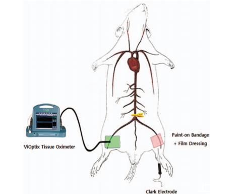在正常灌注條件下,測量左后肢和右后肢的組織含氧量。在本實驗中,我們使用了兩種方法作為對照。我們在右上后肢腹側安裝了一個近紅外成像裝置(組織血氧儀),以評估軟組織血氧飽和度。此外,還將克拉克氧電極(丹麥Unisense)插入左后肢的腓腸肌,以實時監測肌肉內氧張力(肌肉內氧張力)。圖2展示了實驗裝置的概覽。