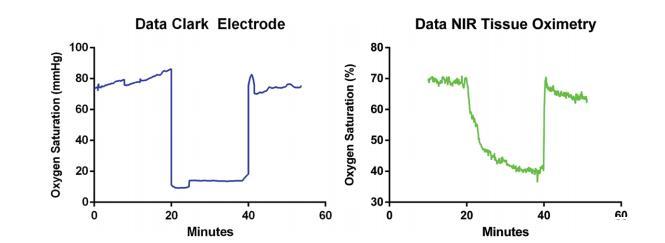 圖4(左)克拉克氧電極測量獲得的平均數據。(右)近紅外(NIR)組織血氧儀得出的平均數據。