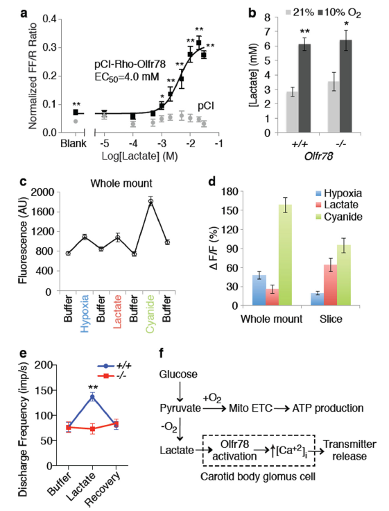 圖4、乳酸激活Olfr78并刺激頸動脈體感覺活動。a.在HEK293T中利用雙報告基因檢測乳酸對Olfr78的激活(空載體灰線,Olfr78黑線)。b.麻醉小鼠缺氧3 min后的動脈血乳酸水平。c,d.GCaMP3標記球細胞在缺氧、乳酸(30 mM)、氰化物(2 mM)刺激下的鈣反應(yīng)。e.野生型與Olfr78-/-CB對30 mM乳酸的竇神經(jīng)放電反應(yīng)。f.氧感受模型:缺氧→線粒體受抑→乳酸↑→結(jié)合Olfr78→球細胞Ca2?↑→呼吸驅(qū)動。