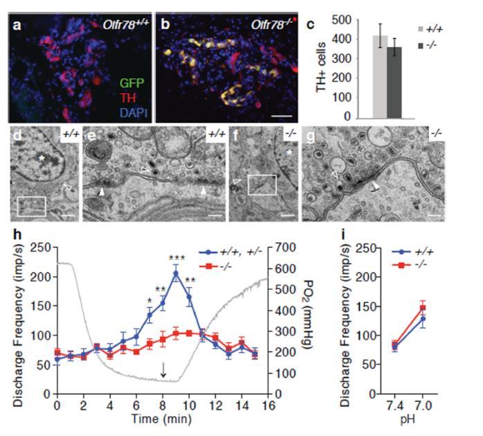 圖3、Olfr78介導(dǎo)頸動脈體氧感受。a,b.Olfr78+/+與Olfr78-/-CB切片:GFP(綠)、TH(紅)、DAPI(藍)。突變體結(jié)構(gòu)正常。c.CB中TH陽性細胞計數(shù)。d–g.透射電鏡:野生型與突變型球細胞均含大核(*)、大致密芯囊泡(空箭頭)及小清芯突觸囊泡(實箭頭)。h,i.以竇神經(jīng)放電頻率評估CB對缺氧(h)及低pH(i)的反應(yīng)?;揖€示灌流液PO?時間曲線