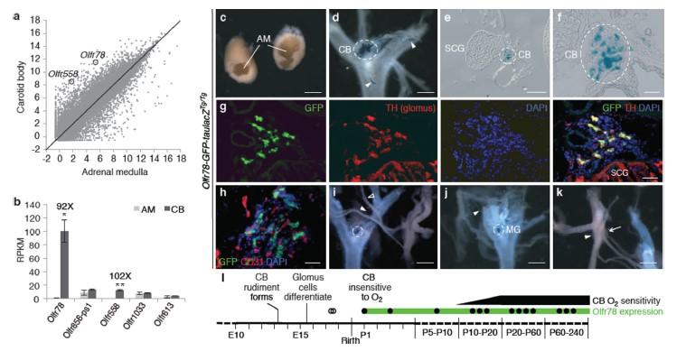 圖1、Olfr78在頸動脈體球細胞中的表達。a.通過RNA測序比較成年小鼠頸動脈體(CB)與腎上腺髓質(zhì)(AM)中26,728個基因的表達水平。以每10^7條比對reads的對數(shù)(log2)表示。b.在CB和/或AM中高表達的嗅覺受體(OR)基因;X表示CB相對于AM的富集倍數(shù)。c–f.Olfr78敲入報告小鼠(Olfr78-GFPtaulacZ)的X-gal染色(藍色,β-半乳糖苷酶活性)。c.腎上腺,未見報告基因表達。d.頸動脈分叉背面觀,可見CB(虛線圈)及偶見血管(箭頭)e,f.頸動脈分叉橫切面及局部放大。g,h.CB切片免疫染色:Olfr78報告基因(GFP,綠色)與球細胞標志物酪氨酸羥化酶(TH,紅色)共定位;不與內(nèi)皮標志物CD31(紅色)共定位。DAPI染核(藍色)。i–k.頸動脈分叉腹面觀X-gal染色:i.CB(虛線圈)由竇神經(jīng)(實心箭頭)支配,后者為舌咽神經(jīng)(空心箭頭)分支。j.異位“微球體”(MG)同樣受舌咽神經(jīng)支配。k.巖神經(jīng)節(jié)(箭頭)、結(jié)狀/頸靜脈神經(jīng)節(jié)(箭頭)均無報告基因表達。l.Olfr78報告基因在CB發(fā)育過程中的表達時間軸:實心圓=強表達;空心圓=未檢出。