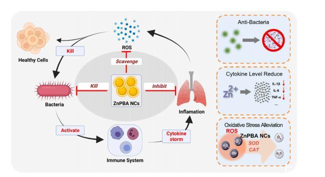細菌性肺炎已被證實會導致急性和嚴重的病理性肺損傷,以及無法控制的氧化細胞因子風暴。針對細菌性肺炎的有效療法要求高效清除病原體、緩解氧化應激和抗炎。然而,目前的療法無法通過一種性能令人滿意的單一藥物來實現這些目標。在此,我們報告了一種自組裝的普魯士藍類似物六氰基鐵酸鋅納米催化劑(ZnPBA NCs),它具有出色的廣譜抗菌活性,并對多種活性氧(ROS)和相關的細胞因子風暴具有抗氧化催化活性。通過使用各種氧化物質和體內小鼠細菌性肺炎模型,我們驗證了合成的六氰合鐵酸鋅納米催化劑可以同時消除細菌感染,并在很大程度上緩解感染引起的氧化應激和炎癥,這表明它在防治多種細菌感染相關疾病方面具有廣闊的臨床應用前景。