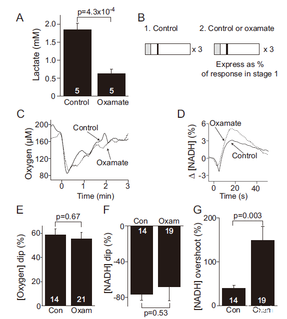 圖4、LDH阻斷不影響O?與NADH初始下降。A圖:LDH抑制劑草酸鹽使細(xì)胞外乳酸減少66%。B圖:實驗設(shè)計(階段2加入oxamate)。C-D圖:oxamate不改變[O?]下降(E)和NADH初始下降(F),但增加NADH超調(diào)(G)(p=0.003),提示糖酵解延遲激活。