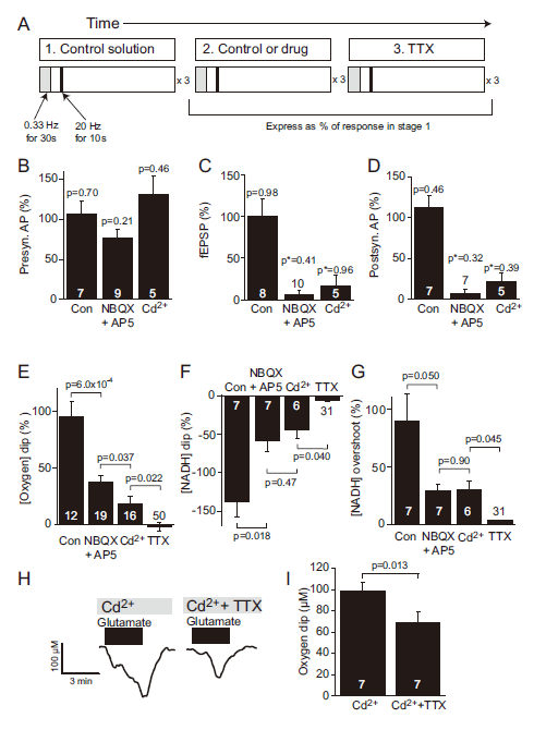 圖2、不同亞細(xì)胞機(jī)制的O?消耗藥理學(xué)分析。A圖:實驗流程設(shè)計(三階段刺激協(xié)議,含藥物干預(yù))。B-D圖:NBQX+AP5(阻斷突觸后電流)選擇性抑制fEPSP和群體峰電位,對突觸前動作電位無影響。Cd2?阻斷突觸傳遞但保留突觸前動作電位,TTX阻斷全部電活動。E-G圖:逐步阻斷突觸后活動(NBQX+AP5)、遞質(zhì)釋放(Cd2?)及全部活動(TTX)使[O?]下降依次減少63%、82%和100%。NADH下降及超調(diào)呈現(xiàn)類似階梯式抑制。H-I圖:谷氨酸(500μM)在Cd2?存在下誘發(fā)的[O?]下降,TTX進(jìn)一步減少29%,表明動作電位消耗O?