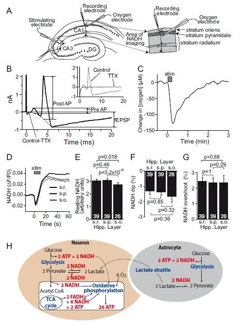 研究簡介:大腦雖然只占體重2%,卻消耗了近20%的靜息能量,其ATP幾乎全部由葡萄糖有氧氧化供給。幾十年來,神經(jīng)代謝領(lǐng)域卻流傳著一個看似矛盾的假設(shè):當(dāng)神經(jīng)元突然高頻放電時,第一時間并不動用“主發(fā)電機(jī)”——線粒體氧化磷酸化,而是先啟動“應(yīng)急電池”——糖酵解,尤其是在星形膠質(zhì)細(xì)胞內(nèi)的糖酵解。本研究利用大鼠海馬腦片,結(jié)合氧微電極記錄、NADH熒光成像及數(shù)學(xué)建模,系統(tǒng)評估了神經(jīng)元活動瞬間的能量來源。傳統(tǒng)觀點(diǎn)認(rèn)為,神經(jīng)活動首先由糖酵解(主要在星形膠質(zhì)細(xì)胞)供能,再通過乳酸轉(zhuǎn)運(yùn)給神經(jīng)元進(jìn)行氧化磷酸化。研究卻發(fā)現(xiàn)在阻斷乳酸脫氫酶(LDH)、或僅用20%O?模擬生理低氧條件下,神經(jīng)元刺激仍迅速降低胞外O?和胞內(nèi)NADH,提示氧化磷酸化被立即動員.藥理學(xué)逐步阻斷突觸前動作電位、Ca2?內(nèi)流-遞質(zhì)釋放、突觸后谷氨酸受體電流及動作電位,可分別減少11%、17%、46%、26%的O?消耗,證明這些關(guān)鍵信息處理環(huán)節(jié)均由氧化磷酸化直接供能.阻斷LDH后,活動誘發(fā)的O?與NADH變化幅度不變,否定了星形膠質(zhì)細(xì)胞-神經(jīng)元乳酸穿梭假說對瞬時能量供給的必要性。該工作顛覆了“先糖酵解后氧化”的傳統(tǒng)教條,明確了大腦信息處理主要由氧化磷酸化實時驅(qū)動,為理解腦能量代謝及fMRI信號生理基礎(chǔ)提供直接證據(jù)。