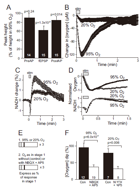 圖3、生理O?水平下氧化磷酸化支持神經(jīng)活動。A圖:20%O?灌流降低fEPSP(38%)和群體峰電位5%),但不影響突觸前動作電位。B圖:20%O?下[O?]下降幅度減小但持續(xù)時間延長(恢復(fù)需5分鐘)。C圖:NADH初始下降及超調(diào)幅度在低O?下降低。D圖:標(biāo)準(zhǔn)化后的O?下降與NADH超調(diào)時間重疊。E-F圖:NBQX+AP5在95%和20%O?下對[O?]下降的抑制比例無差異(63%vs.68%),表明突觸后O?消耗與O?水平無關(guān)。