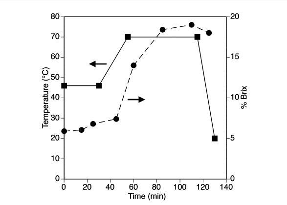 糖化:采用經(jīng)修改的國(guó)會(huì)糖化法進(jìn)行糖化。使用MA-001糖化裝置(Lg-automatic ApS,Frederiksvaerk,Denmark)。精細(xì)研磨、充分溶解的麥芽(丹麥麥芽集團(tuán),Vordingborg,丹麥)(100克)在46°C下與200毫升去離子水混合糖化30分鐘,然后溫度升至70°C(每分鐘升溫1°C)并保持25分鐘。當(dāng)溫度達(dá)到70°C時(shí),向醪液中加入100毫升去離子水。在70°C下保持60分鐘(糖化休止),然后將醪液冷卻至室溫(圖1)。為確保所有樣品的干物質(zhì)含量相同,每個(gè)燒杯通過添加去離子水調(diào)整至相同的重量450.0克。隨后將醪液通過開放式折疊濾紙(#597 1/2,Whatman,Schleicher&Schnell,Dassel,Germany)過濾,甜麥汁樣品在過濾后立即冷凍。在糖化程序結(jié)束前收集的麥汁樣品,在過濾前也通過向燒杯中添加去離子水將總重量調(diào)整至450克。所有樣品在冷凍前進(jìn)行了白利糖度(Brix%)測(cè)量。