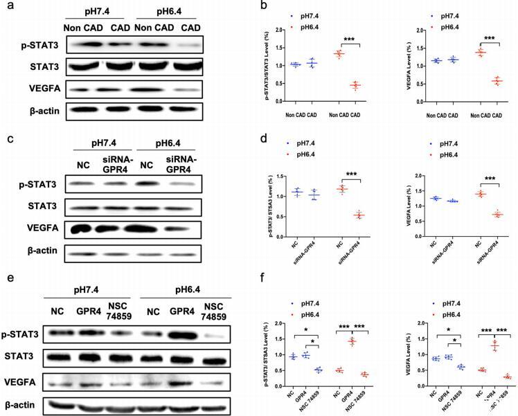 此外,我們還研究了GPR4信號通路激活對STAT3磷酸化(p-STAT3)和VEGFA表達的影響。我們的數據顯示,與非CAD患者相比,p-STAT3和VEGFA的表達在pH值為6.4時明顯降低,而在pH值為7.4時組間差異不顯著(圖5a,b)。為了進一步證實GPR4在酸性微環境中的血管生成能力,我們用siRNA沉默了EPCs中GPR4的表達。免疫印跡證實了GPR4、STAT3和VEGFA在EPCs中的表達。我們的數據顯示,siRNA-GPR4在pH6.4時會降低p-STAT3和VEGFA的表達,但在pH7.4時不會(圖5c,d)。