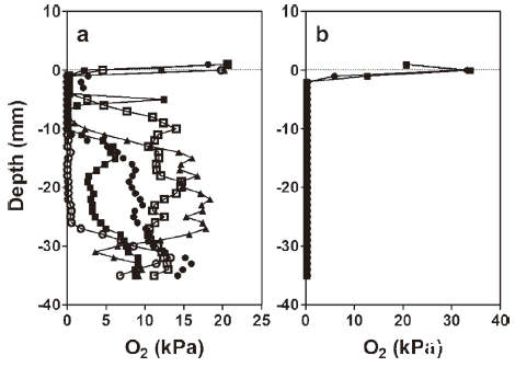 圖3、英國蘇塞克斯郡肖勒姆海邊鹽沼的土壤氧分壓隨深度變化的剖面圖;不同的線條(和符號)代表重復測量的剖面。(a)海濱堿蓬生長區(qū)域的土壤;(b)稀疏分布著Salicornia sp.的泥灘。海濱堿蓬生長區(qū)域(a)比泥灘(b)高出33厘米。這些測量是在2010年7月20日進行的,當時7:00的高潮位為5.17米,測量時間在高潮后3小時內。測量期間的光合有效輻射(PAR)在(a)中為~360–420μmol m?2s?1,在(b)中為~615μmol m?2s?1。這次潮汐淹沒了泥灘(水位高出表面約3厘米),但沒有淹沒海濱堿蓬生長區(qū)域。海濱堿蓬生長區(qū)域在前一晚被5.37米的潮汐淹沒。圖中比較了海濱堿蓬的生長區(qū)域和泥灘區(qū)域的土壤氧含量隨深度的變化。結果顯示海濱堿蓬的生長區(qū)域的土壤在表層以下仍有一定量的氧,而泥灘區(qū)域的土壤在2毫米以下就幾乎檢測不到氧。這表明海濱堿蓬生長區(qū)域的土壤有更好的排水和氧進入條件。