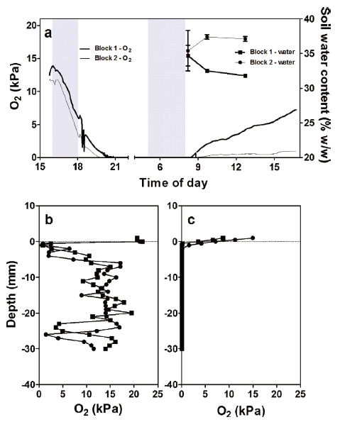 圖5、(a)含有海濱堿蓬的土壤塊在溫室水槽實驗中10毫米深度處的土壤氧對淹沒的響應。灰色背景表示淹沒期。含有植物的土壤塊是從英國蘇塞克斯郡肖勒姆海邊的鹽沼中挖掘出來的,并插入到單獨的土壤篩中(底部有網(wǎng)眼以便水的進出和排水),并放置在水槽內的礫石上。一個由定時器控制的潛水泵將半濃度人工海水輸送到水槽中,以模擬潮汐(水位高出土壤表面2厘米);一次淹沒在下午,一次在第二天早上。使用文中所述的氧微電極進行測量。圖(a)中的插圖還顯示了第二次淹沒期間土壤含水量隨時間的變化。還測量了土壤塊在淹沒前(b)和淹沒后約2小時(c)的土壤氧分壓隨深度的剖面。圖中展示了在控制實驗條件下,土壤氧含量在淹沒期間的變化。結果顯示,淹沒期間土壤氧含量顯著下降,且在淹沒后繼續(xù)下降。這與實地測量結果一致,進一步證實了潮汐淹沒對土壤氧含量的影響。