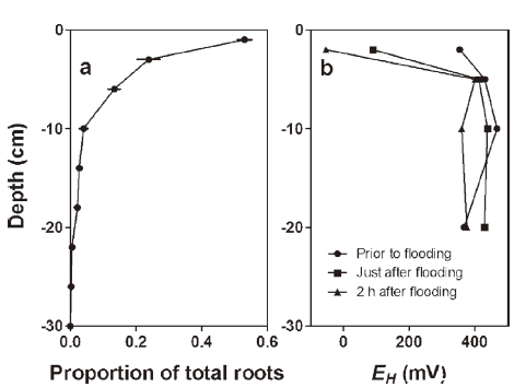 圖4.英國蘇塞克斯郡肖勒姆海邊鹽沼中海濱堿蓬生長區(qū)域的根系分布隨深度變化(a)和土壤氧化還原電位剖面(b)。為了測量根系分布,以單株海濱堿蓬植物為中心,取直徑為6厘米的完整土芯,深度為25-30厘米。將根從土芯中沖洗出來,用篩子篩選,并在60°C下烘干以確定干重。這些土芯是在2010年7月20日采集的。給出的值是平均值±標準誤差(n=4)。平均地上部干重為1.36±0.34克(n=4)。由于未采樣延伸超過3厘米的側根,因此該程序未能捕獲每株植物的總根干重。氧化還原電位是通過將鉑絲探針插入沉積物中測量的,此圖展示了海濱堿蓬的根系分布和土壤氧化還原電位隨深度的變化。根系分布顯示,根主要分布在較淺的土壤層,但也有少量根延伸到較深的土壤中。氧化還原電位的測量表明,表層土壤的氧化還原電位在潮汐淹沒后顯著下降,而深層土壤的氧化還原電位則相對穩(wěn)定。
