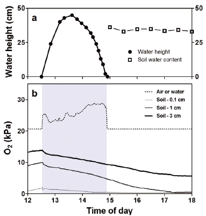 圖2、(a)高潮時的水位和持續(xù)時間;(b)英國蘇塞克斯郡肖勒姆附近的鹽沼中海濱堿蓬生長區(qū)域土壤在3個深度以及距土壤表面2厘米處的空氣/水中的氧分壓響應。灰色背景表示淹沒期。這些測量是在2010年7月28日進行的,當天下午13:37的高潮位為5.81米。水的平均溫度為22.5°C,土壤溫度為23.1°C(2厘米土壤深度)。高潮時的水的電導率為52.2,pH值為8.2。圖中展示了潮汐淹沒期間土壤氧含量的變化。圖中顯示,淹沒期間土壤氧含量顯著下降,即使在水位退去后,氧含量仍繼續(xù)下降。這表明潮汐淹沒對土壤氧含量有顯著影響。