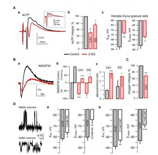 圖1抑制海馬體切片糖酵解時的代謝和電參數。A:a)在CA1區,2-DG(7mM 15mM葡萄糖,抑制糖酵解約35%)降低了刺激Schaffer支脈誘發的eLFPs(施加2-DG后40分鐘)。然而,在一個切片中,eLFPs沒有減少,并顯示出多個次級尖峰(見插圖),表明網絡興奮性過高;b)2-DG減少了CA1(n=6,P<0.001)和齒狀回(n=4,P<0.03);=(c)2-DG引起靜息膜電位(Em;n=8,P<0.01)和GABA介導的電流反轉電位(EGABA;n=6,P<0.05)的去極化。B:2-DG還降低了CA1(n=6,P<0.001)和齒狀回(n=4,P<0.03)對突觸刺激(10Hz,10秒)反應的(a)(b)NAD(P)H瞬態和(c)驟降/過沖比顯著增加,與糖酵解受抑制一致。C:2-DG能明顯降低突觸刺激時的耗氧量。D:a)0.1mM 2,4-二硝基酚(DNP)抑制線粒體呼吸誘導靜息膜電位(Em;n=9,P<0.01)和EGABA(n=8,P<0.001),通過單個NMDA和GABA受體通道的細胞附著貼片記錄測量L2/3錐體細胞;b)將ACSF葡萄糖濃度降至0.2mM(n=6,Em和EGABA分別為P<0.05和0.01)也可獲得類似的效果。兩種情況下細胞內ATP濃度的降低程度相似。